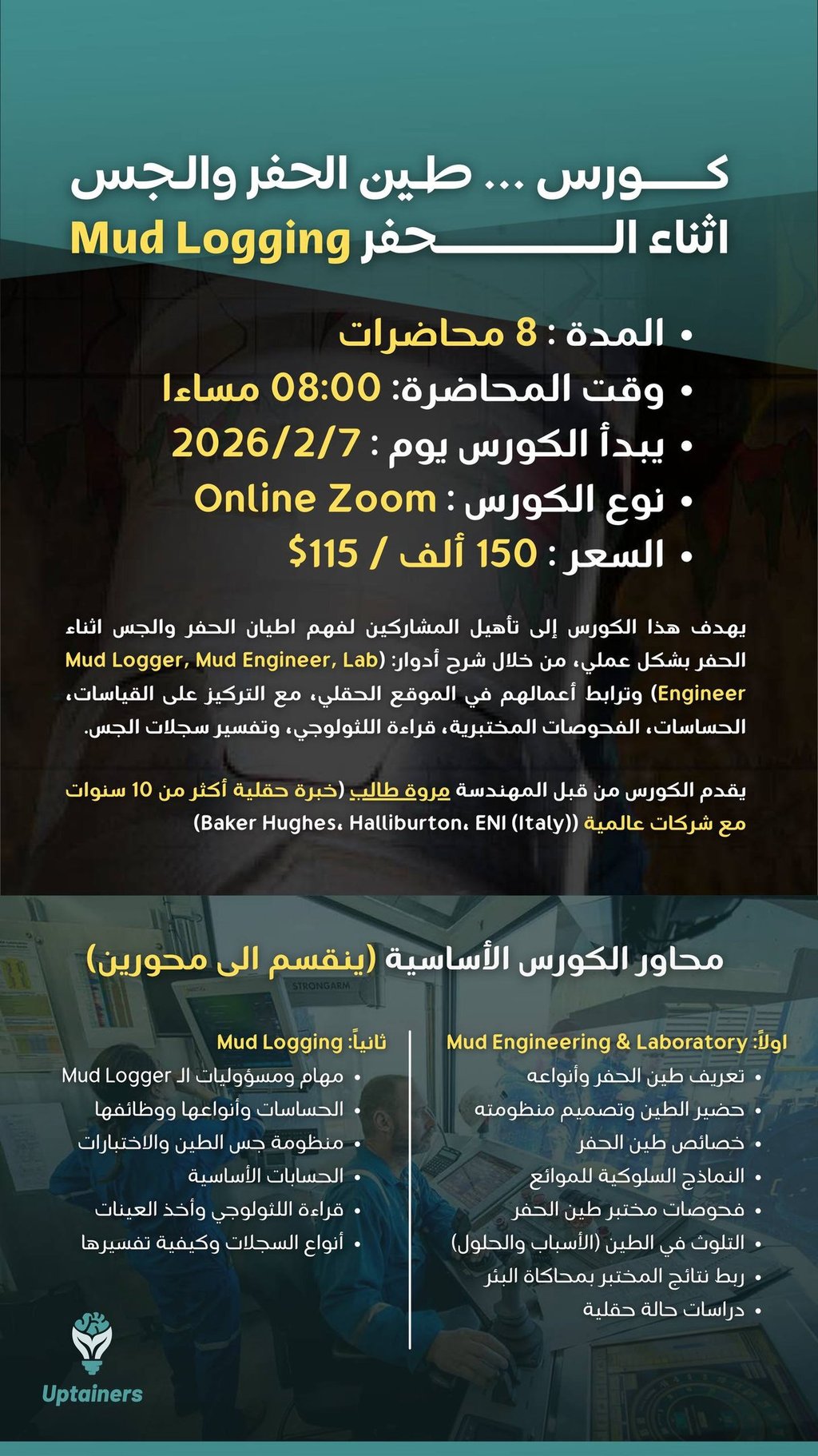 This course aims to equip participants with a comprehensive and practical understanding of drilling fluids and mud logging operations through explaining the roles of Mud Logger, Mud Engineer, and Laboratory Engineer